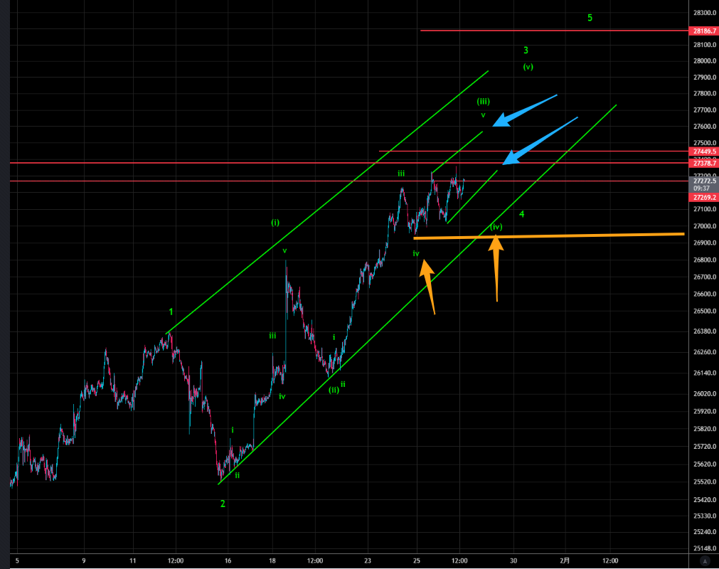 現状は以下のように推移しています。エンディングダイアゴナルかどうか?は分かりませんが、もしかしたら、エンディングダイアゴナルが完成してオレンジラインまでの下落があるかも知れない。という状態で今晩のFOMCをむかえています。