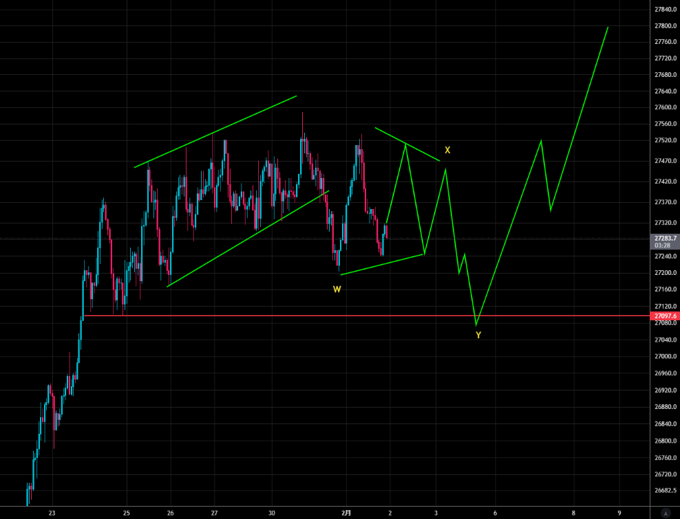 ここからは、例えば以下のような展開、すなわちトライアングルがX波になったダブルジグザグが完成してその後は反転上昇。