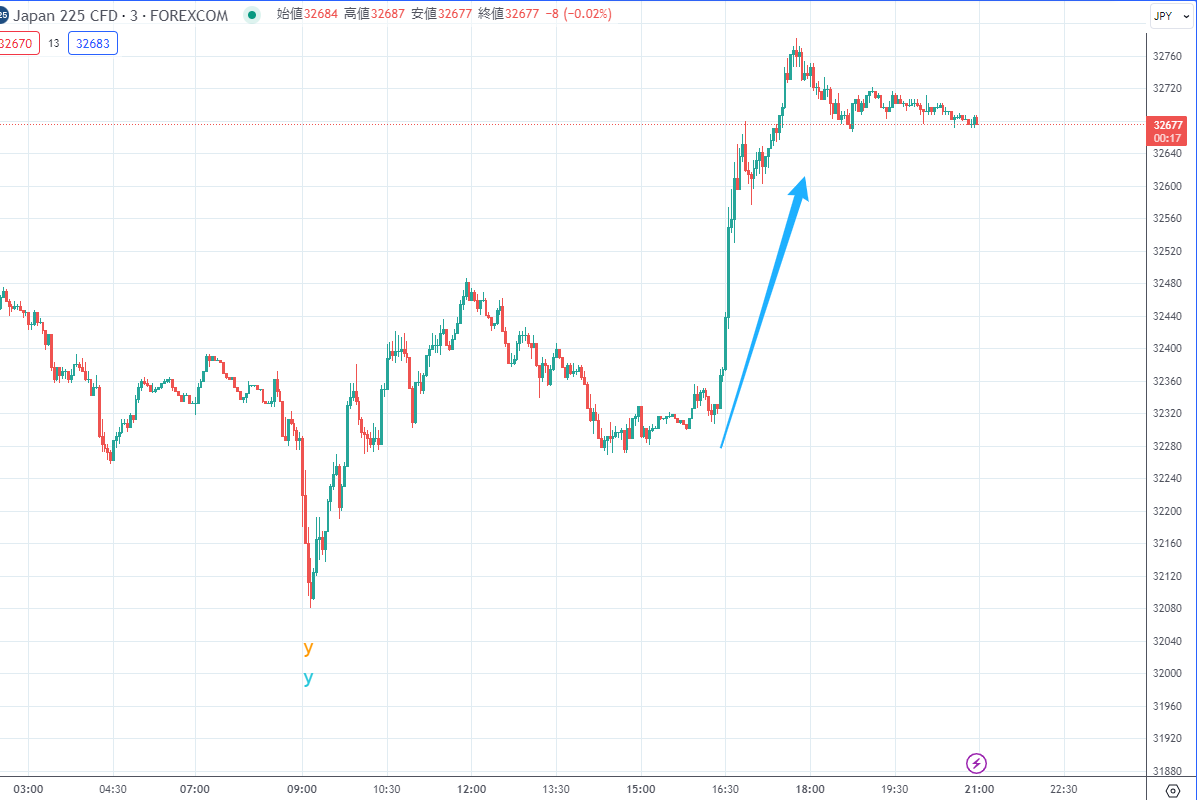 先物は日中終値32270円に対し、ナイト始値32350円、その後32760円まで急伸しました。