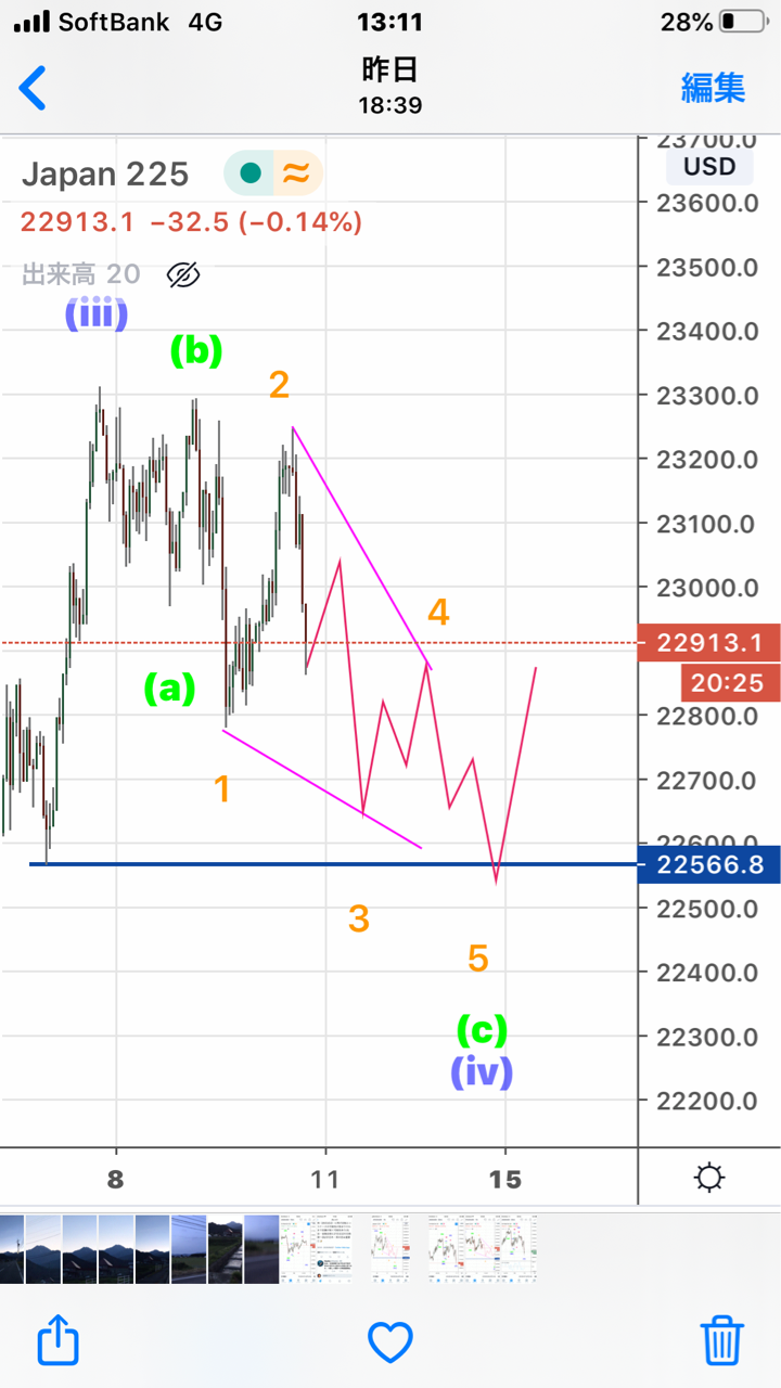 OANDAのチャートカウントであれば高値からフラットシナリオなので、最短でそのフラット完成をもって調整完了もあり得た訳ですが、FXCMのチャート形状が高値からダブルジグザグで終わらずにダイアゴナル系になればそうたやすく戻れないということになりますね。いずれにしてもここからは反騰待ちです。