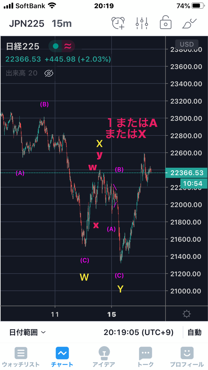 高値からWXYのダブルジグザグの下落で底打ちのカウントです。気になっていたのは下記の黄色のy波の(B)がトライアングルに見えること。素直に高値から5波動の下落カウントだけに絞り切れなかったのはこんな理由なのですが、こんなのは皆さんの参考にならんですよね