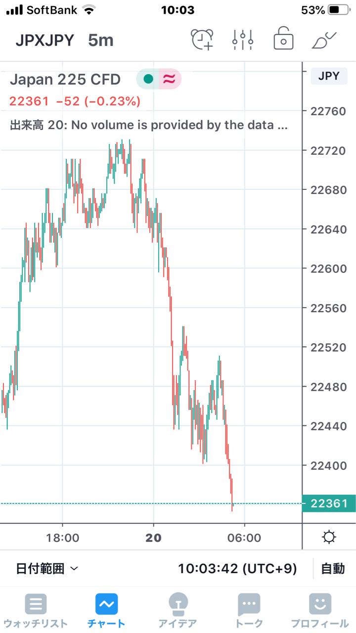 IG証券の日経225CFDは週明け朝7時から取引が始まりますが、今週の明けは22040円付近でスタートして10分後には22870円割れまで下落しました。