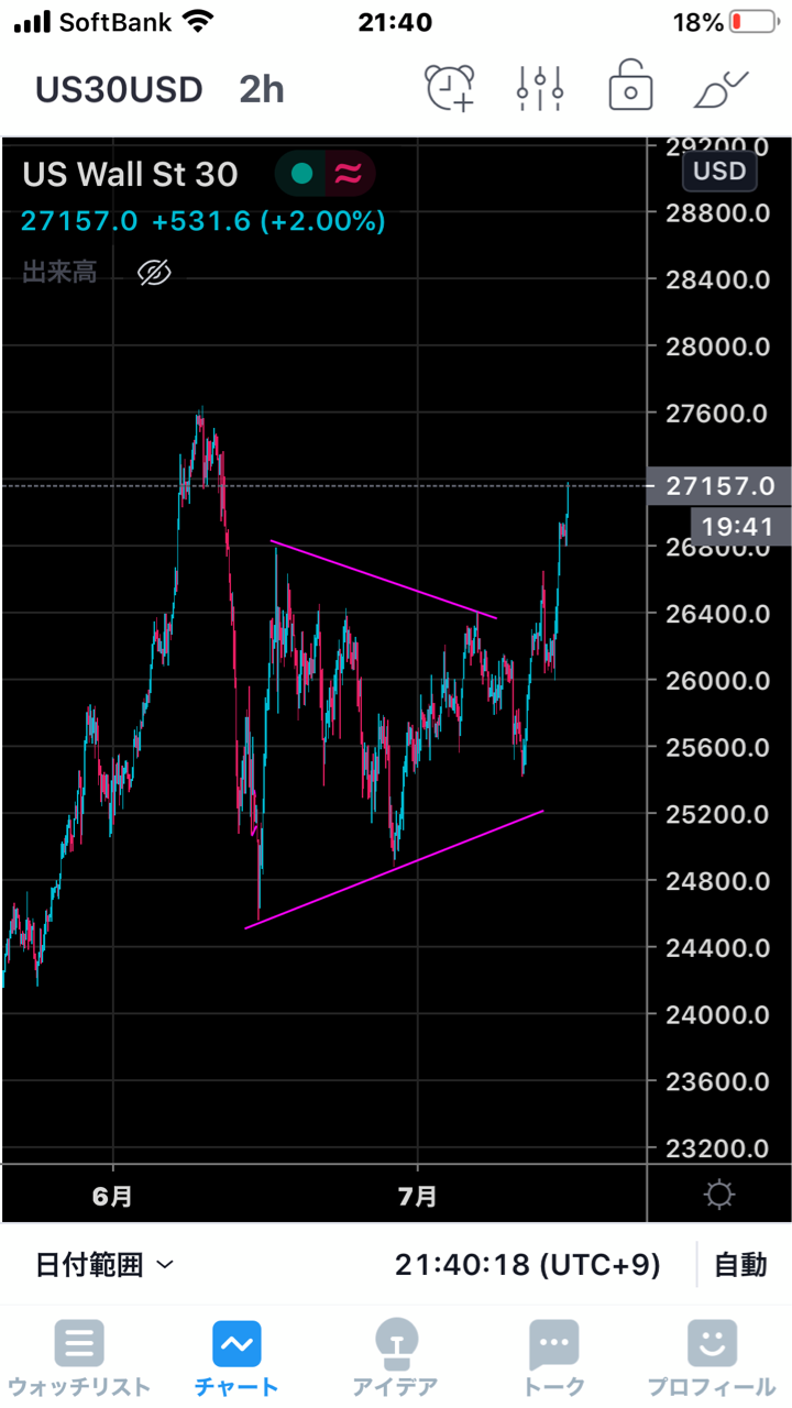 このようにラインを引くと綺麗なトライアングル上抜けに見えるかもしれませんが、果たして